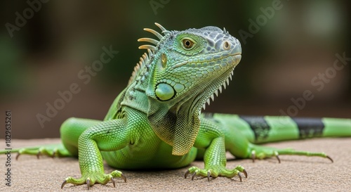 Fototapeta premium A captivating close-up of a vibrant green iguana showcasing its scales and...