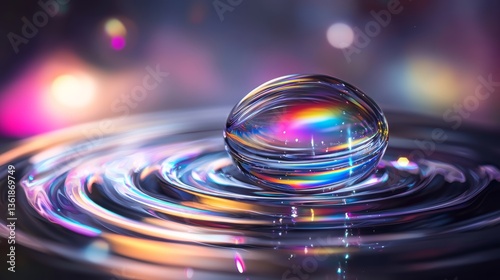 © Wimon, Obraz premium A captivating close-up of a water droplet creating ripples, showcasing vibrant colors and reflections against a dreamy background.