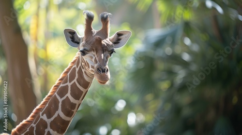 © Zhanna, Fototapeta premium A captivating close-up portrait of a giraffe, highlighting its expressive face and unique patterns. The lush green foliage in the background adds a serene and natural ambiance, making this image