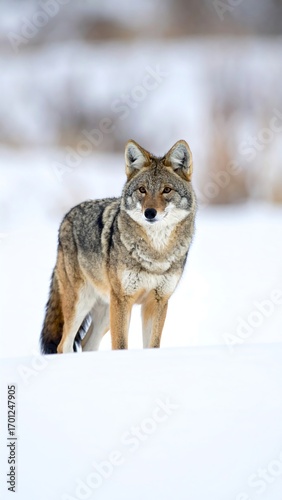 Fototapeta premium A captivating coyote stands poised in a snowy landscape, its gaze directed...