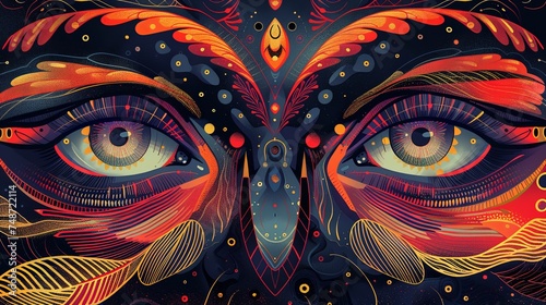 © Pui, Naklejka premium A captivating digital illustration showcasing a pair of human eyes, adorned with intricate patterns and vivid colors set against a dark celestial background.