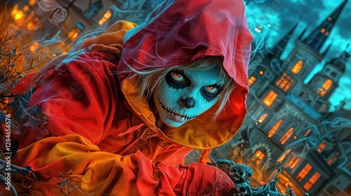 © AI by Derek, Fototapeta premium A captivating figure in a bright red and yellow hooded costume kneels among twisted branches, revealing eerie blue skin and striking makeup against the backdrop of an ominous mansion.