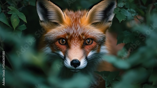 © nirabs_creative, Obraz premium a captivating fox peering out from verdant foliage, eyes locked on the viewer, showcasing natural beauty