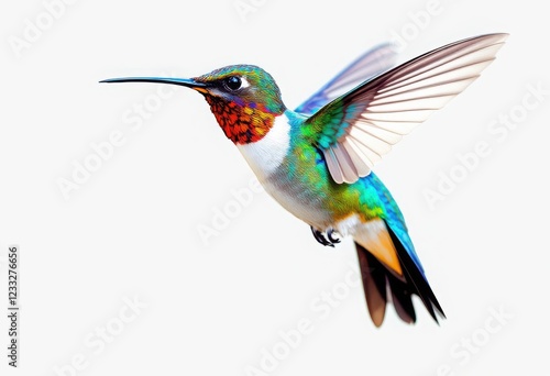 Fototapeta premium A captivating hummingbird displays its vibrant plumage in mid-flight, against a stark white backdrop, Generative AI