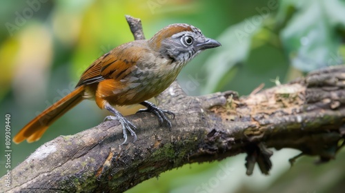 © Matthew, Fototapeta premium A captivating image featuring a brown bird with prominent eyes perched on a branch in its natural habitat