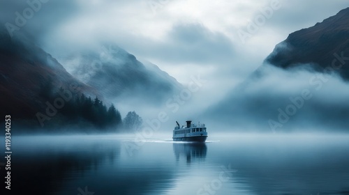 © Jonile, Naklejka premium A captivating image of a ferry gliding through a misty landscape, creating a sense of mystery and tranquility