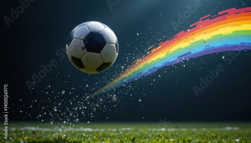 Fototapeta premium A captivating image of a soccer ball caught in mid flight, leaving a trail of rainbow colors against a dark backdrop.