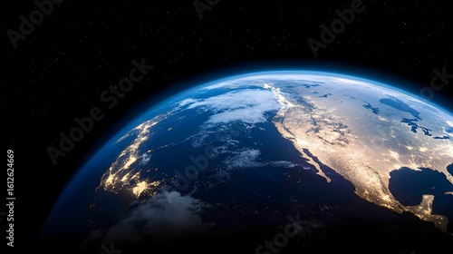 Fototapeta premium A captivating image shows Earth from space, with city lights illuminating the night and a starry backdrop enhancing its beauty and grandeur.