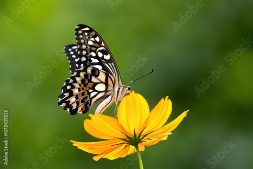 © Nur, Fototapeta premium A Captivating Lime Butterfly Sipping Nectar from a Vibrant Yellow Cosmos Flower in a Lush Green Garden Setting, Showcasing Nature's Delicate Beauty and Interconnectedness