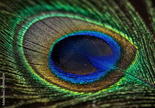 © Selda, Naklejka premium A captivating macro shot of a peacock feather, displaying vibrant colors and detailed textures.