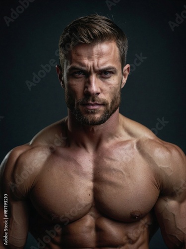 © theartofphoto, Fototapeta premium A captivating model poses confidently in a studio, highlighting his sculpted physique and striking features against a dark backdrop.