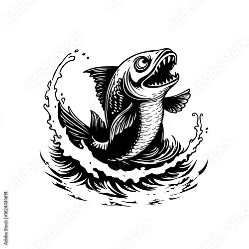 Fototapeta premium A captivating monochrome vector illustration of a ferocious fish emerging...