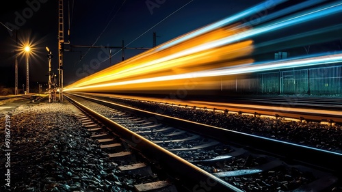 Naklejka premium A captivating night scene of train tracks, showcasing dynamic light trails...