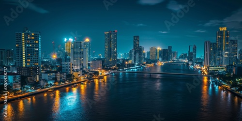 © Armin, Fototapeta premium A captivating night view of a city skyline featuring illuminated skyscrapers and their reflections on the river, showcasing the bustling urban life and modern architecture.