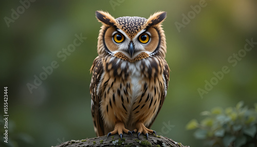 © Usama, Obraz premium A captivating owl with striking yellow eyes perches on a branch, its detailed feathers showcasing nature's beauty in soft, blurred greenery.