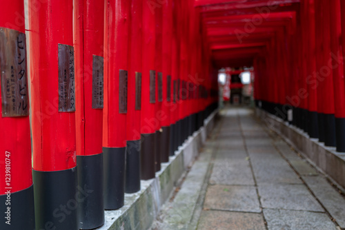 Fototapeta premium A captivating pathway of vibrant red torii gates leads to a serene Japanese...