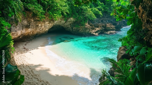 Naklejka premium A captivating photograph of a hidden, serene beach with white sand and calm, turquoise waters. The surrounding cliffs and lush vegetation create an idyllic and tranquil atmosphere in this isolated