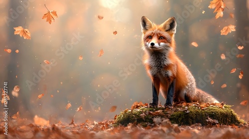 © Heng Heng - AI Stock, Obraz premium A captivating photograph showcasing a playful red fox standing gracefully on a moss covered rock in a serene woodland environment surrounded by golden autumn leaves and a peaceful atmosphere