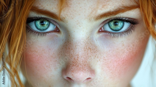 © vimp, Fototapeta premium A captivating portrait features a young figure with bright green eyes and vivid red curls