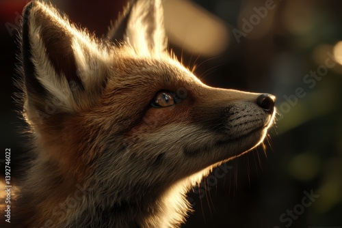 Fototapeta premium A captivating portrait of a red fox gazing upwards, bathed in golden sunlight, with a soft focus background highlighting its fur texture and curious expression.
