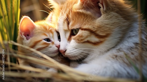Naklejka premium A Captivating Scene of Motherly Love and Innocence Between a Cat and her Kitten