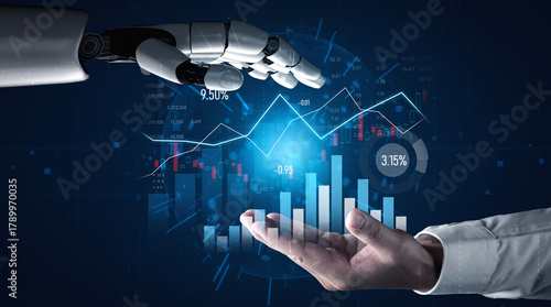 © InfiniteFlow, Fototapeta premium A captivating scene showcasing the interaction between a human hand and a robotic hand amidst vibrant data analytics and financial graphs. Scalp