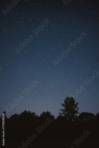 © Pablicus, Fototapeta premium A captivating starfield blankets a tranquil nightscape above a silhouette of trees, creating a serene contrast between the celestial and terrestrial.