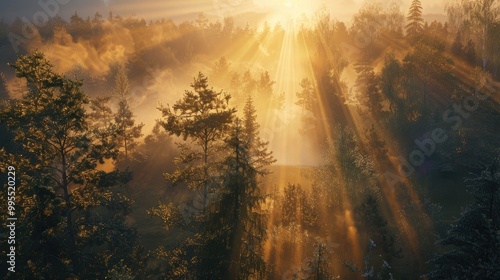 © Lilly, Obraz premium A captivating sunrise over a misty forest with sunbeams filtering through the trees.