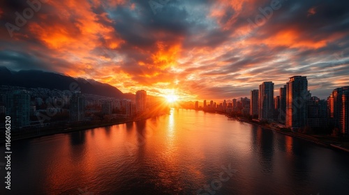 Fototapeta premium A captivating sunset illuminates the skyline with vibrant colors, emphasizing the balance between urban architecture and the encompassing natural landscape by the water.