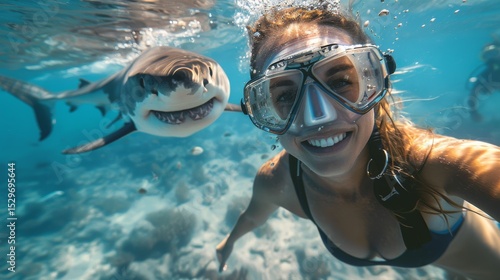 © Pinklife, Naklejka premium A captivating underwater selfie captures a smiling diver alongside a curious shark, showcasing the thrill of ocean exploration and a deep connection with marine life.