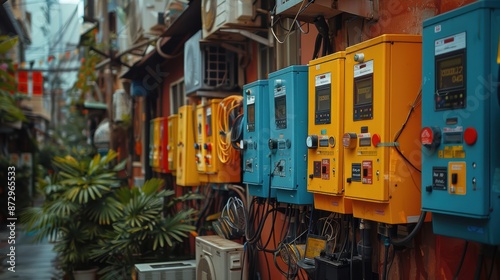 Fototapeta premium A captivating urban scene exhibits a vibrant array of diverse utility control panels on a colorful wall, highlighting the intersection of technology and daily life