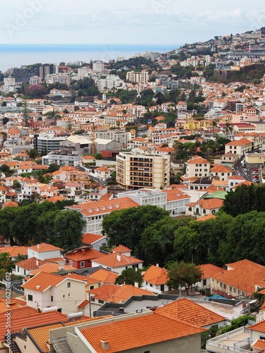 Fototapeta premium A captivating view includes modern high-rises combining with traditional structures scattered across a hilly cityscape, under a cloudy sky, showing urban diversity - Funchal, Madeira, Portugal.