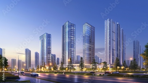 © 熙妍 杨, Naklejka premium A captivating view of the background with modern commercial high - rise buildings. The buildings have sleek and stylish designs. They stand tall and proud, reaching towards the sky. There are large gl