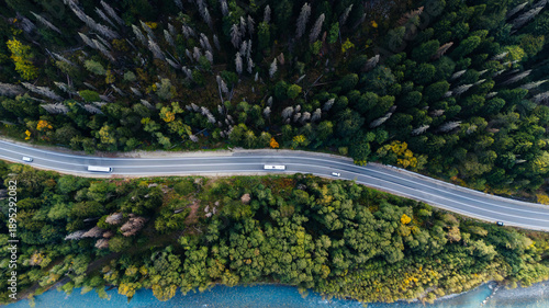 © Павел Чигирь, Fototapeta premium A car driving along a mountain road in an autumn forest, seen from a drone