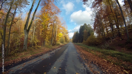 © progressman, Obraz premium a car driving down a road with trees in the background