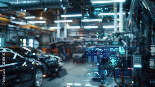 © altaf, Fototapeta premium A car is shown in a factory with a computer screen displaying a car's engine
