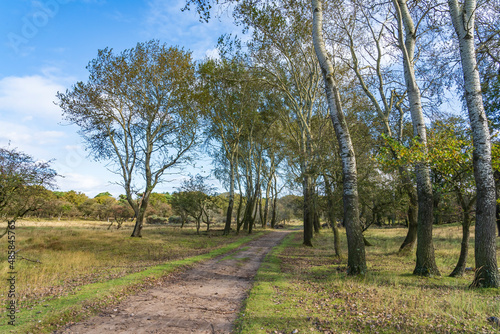 © Emma, Fototapeta premium A car track runs through a group of birch trees with white bark that contrasts beautifully against the blue sky in the beautiful dune area of ​​the Amsterdamse Waterleidingduinen