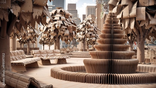 © Arman, Fototapeta premium A cardboard city park, featuring paper trees, benches, and a fountain made from folded cardboard.
