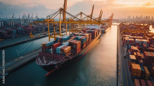 © Oulaphone, Obraz premium A cargo ship loaded with colorful containers navigates through a harbor, surrounded by cranes and city skyline under a sunset sky.