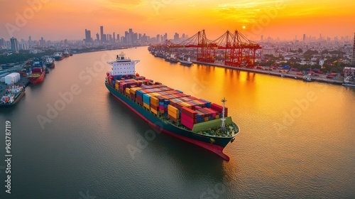 Naklejka premium A cargo ship navigates a river at sunset, with cranes and a city skyline in...