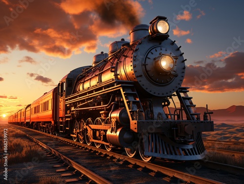© Darcraft, Fototapeta premium A cargo train hauling containers and merchandise barrels travels down a railroad track through a rural landscape at night.