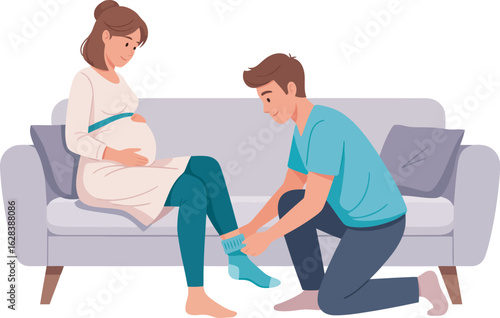 © Rifqi, Fototapeta premium A caring man kneels to help a pregnant woman put on a blue sock while she rests on a sofa.