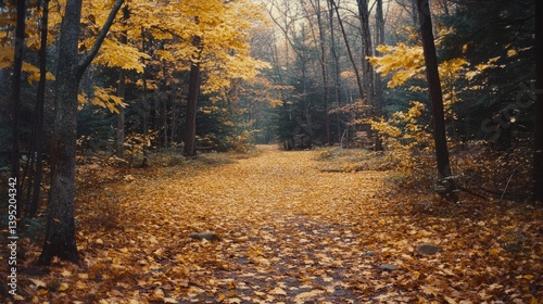 Obraz premium A carpet of golden leaves covers a woodland path, inviting exploration and...