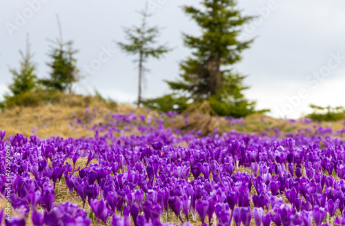 Naklejka premium A carpet of many Purple Crocus Flowers on a mountain field