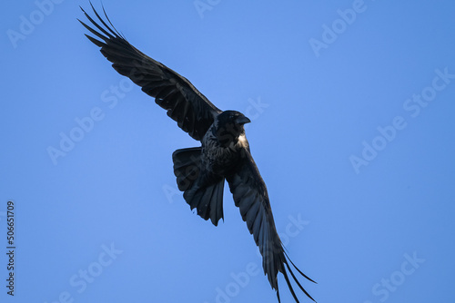 Obraz premium A carrion crow in flight blue sky