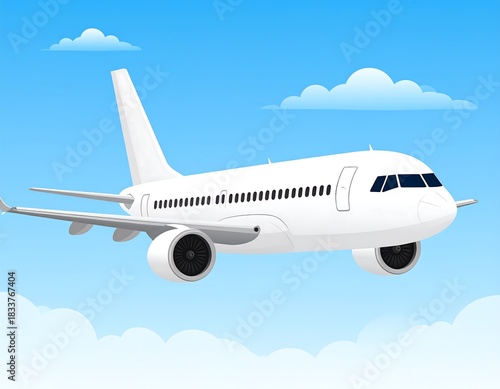 © somad, Obraz premium A cartoon airplane flying through a bright blue sky with fluffy white clouds