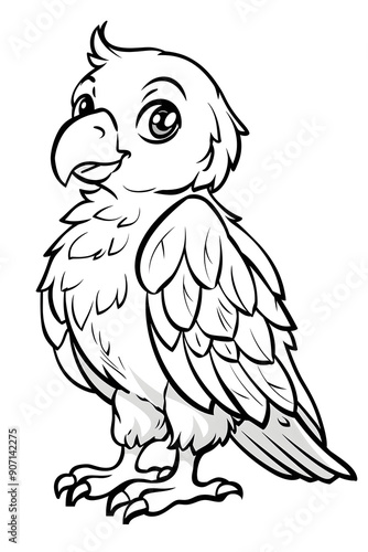 Fototapeta premium A cartoon black and white drawing of a happy bird with a large beak, perched...