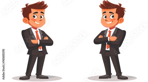 Fototapeta premium A cartoon business professional sitting at a desk, concentrating on important documents. Wearing a formal suit and tie, with a serious expression. Working on a big project and making plans. The cartoo