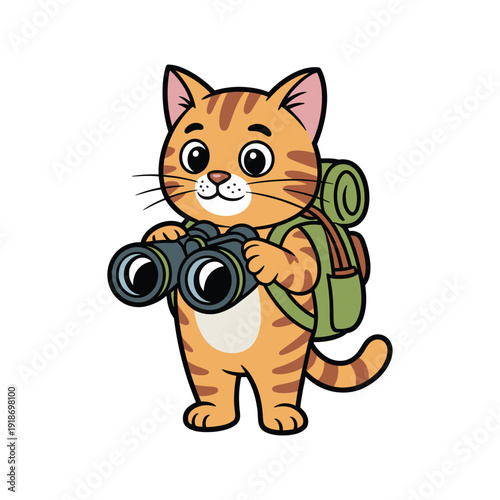 © Kashan, Fototapeta premium A cartoon cat with a backpack holds binoculars, ready for adventure.