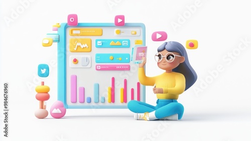 © BerkahStock, Obraz premium A cartoon character interacts with a digital dashboard displaying data and social media icons.